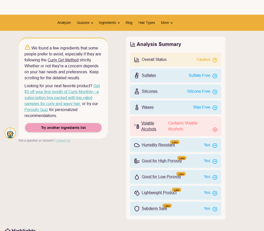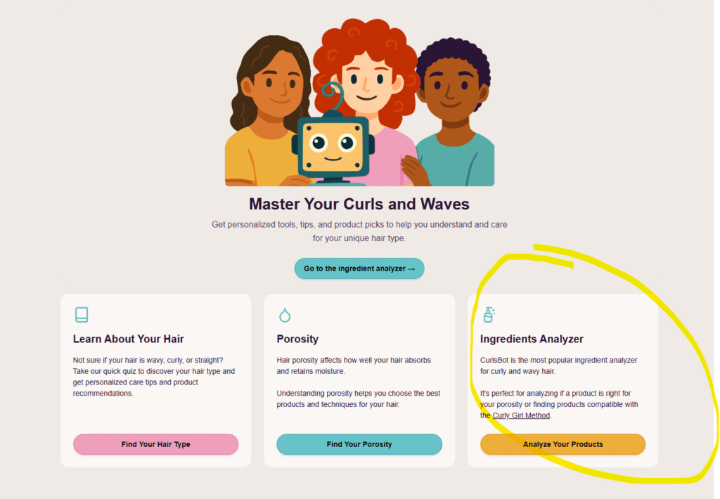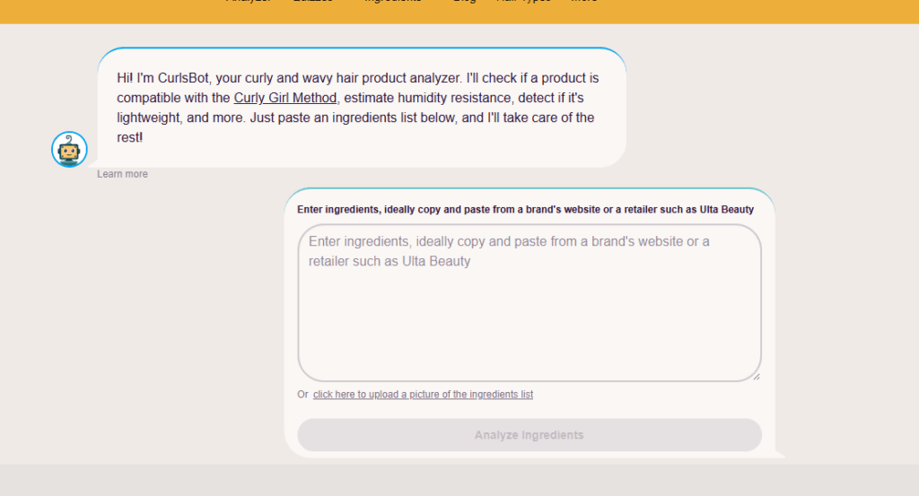 V Curly Girl method můžeš k rychlé kontrole složení produktů využít nástroj Curlsbot. Stačí zkopírovat seznam ingrediencí přímo z e-shopu, vložit ho do prázdného rámečku a okamžitě zjistíš, zda produkt odpovídá pravidlům CGM. Tento nástroj filtruje složky, kterým se metoda snaží vyhnout. Je v angličtině, ale stránku lze přeložit do češtiny.